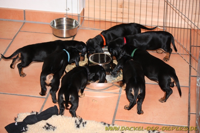 Zu den Bildern der 1. Woche ![]() Nach einer unruhigen Nacht von Samstag auf Sonntag mit all dem typischen "Gerenne" und "Gefiepe" bekam Karla zwischen 05.00 und 09.00 Uhr sieben Welpen mit sehr ausgeglichenen Gewichten zwischen 240 und 265 Gramm. Drei Prinzen und vier Prinzessinnen. Alle waren sogleich putzmunter. Karla versorgte die Babies instinktsicher, gründlich, aber ruhig. In den nächsten Tagen werden wir Einzelfotos machen. Haben Sie Interesse an einem unserer Welpen? Dann lernen wir Sie ab der 3. Lebenswoche gern persönlich kennen. Die kleinen Dackel können im Februar in ihre neuen Famiien ziehen. |