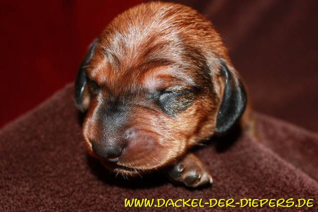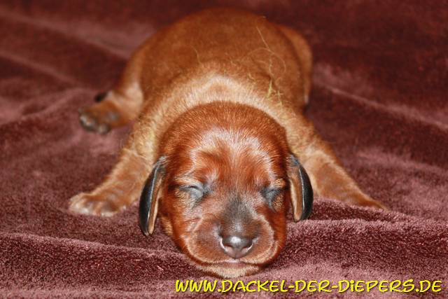Noch eine Stunde zuvor hadert unsere Disney arg mit ihrem dicken Bauch und kreiselt durch den Garten. Eigentlich hätte sie auch gern dort ihre Welpen bekommen - in der Hundehütte. Da sie sich aber doch mit dem dem ersten Welpen recht schwer tat und unsere Hilfe benötigte, musste sie da raus. Sie liess sich dann auch überreden..... ![]() der erste Welpe, ein roter Rüde mit 301g das ist auch ein schwerer Brocken für den Anfang ![]() ....und gleich ran an die Milchbar, so viel Auswahl hat er nicht mehr lang ![]() noch leicht feucht sehen die Kleinen aus wie Streifenhörnchen ![]() Nr. 2 und 3 sind 2 rote Hündinnen mit 237g und 254g ![]() Nr. 4 ist eine schwarz-rote Hündin mit 225g Diesmal hat uns Mendel nicht betuppt. Es gab durchaus eine gewisse Wahrscheinlichkeit, dass sich die Farbe der jeweiligen Großmutter durchsetzt, denn sowohl Disneys Mutter Karla, als auch die Mutter von MaJu´s Anton ist schwarz-rot. ![]() Nr. 5 ist wieder ein Rüde - mit einem winzigen kleinen Brackenstrichlein Wie auch Disney als Welpe, ist dieser kleine Rüde noch sehr stichelig in der Farbe. Das wird sich rauswachsen und er wird sicher auch dieses leuchtende hirschrot bekommen wie seine Eltern. ![]() Und als Abschluss hat uns Disney noch ein kleines Lakritzschneckchen ins Nest gelegt, die kleinste Hündin mit 211g ![]() Disney ist eine ganz stolze Mama und kümmert sich rührend um die Kleinen. Sie war ja schon beim E- , F- und G- Wurf eine bezaubernde Nanny ![]() Die ersten Portraits, die Welpen sind 5 Tage alt Rüde, rot mit Brackenstrichlein (das man jetzt hier aber nicht sieht) "Herby" ![]() ![]() ![]() ![]() ![]() ![]() ![]() ![]() ![]() ![]() ---------------- Rüde, rot - der Erstgeborene ![]() ![]() ![]() ![]() ![]() ![]() beide roten Rüden ![]() ---------------------------- Hündin, schwarz-rot mit weissem Band) ![]() ![]() ![]() ![]() ![]() ------------------------ Hündin, schwarz-rot - die Letztgeborene ![]() - ![]() ![]() ![]() da sie die leichteste ist, bekommt sie hin und wieder ein Extraschlückchen Im Moment nennen wir sie "Herzchen" ![]() ----------------------- Hündin, rot ![]() ![]() ![]() ![]() ![]() ![]() --------------- Hündin rot mit orangenem Band ![]() ![]() ![]() ![]() |