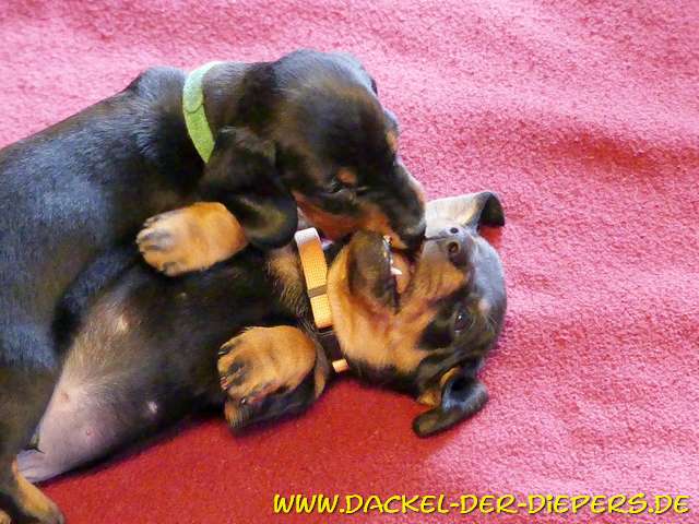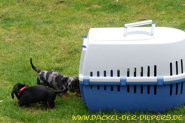 Wir beginnen mit ein paar Portraits bevor wir die Osterwoche an uns vorbei ziehen lassen. Grün - Leo(nard) ![]() ![]() ![]() Rot - Ludwig ![]() ![]() ![]() Tiger - Lucy Lou ![]() ![]() ![]() Blau - Loisl ![]() ![]() ![]() Beige - Lump ![]() ![]() ![]() Hündin - Lakritze ![]() ![]() ![]() ![]() Und nun die Woche Ein grosser Meilenstein stand an: Das erste Fressen Da wir diesmal recht spät mit dem Zufüttern angefangen haben, klappte das gleich prima. Alle haben ordentlich zugeschlagen. ![]() ![]() Auch den Garten haben sie jetzt kennengelernt. Noch sind sie da nur kurz, aber sie sind neugierig. ![]() ![]() ![]() Und dann hatten wir über Ostern eine wahre Besucherflut. Nicht nur Interessenten für die jetzigen Welpen, nein, neue Welpen sind immer ein willkommener Anlass für ein Ehemaligentreffen. Darüber freuen wir uns natürlich sehr, die mittlerweile erwachsenen Dackel-der-Diepers wiederzusehen ![]() Richtig gut tut den Welpen die Sozialisierung, die Erfahrung mit vielen Menschen in Kontakt zu kommen. Natürlich nur schöne Momente. Alle möchten die Welpen beschmusen und mit ihnen spielen. ![]() ![]() Dabei werden auch schon kleine Kämpfe gezeigt, was mal ein grosser Dackel werden möchte.... ![]() ![]() ![]() ![]() ![]() ![]() ![]() Emma sieht es gelassen ![]() ![]() ![]() ![]() ![]() ![]() ![]() ![]() ![]() ![]() ![]() Lange halten die Kleinen es aber noch nicht aus wach und munter zu sein. Maximal eine halbe Stunde, dann sackt einer nach dem anderen in den Schlummerschlaf. ![]() ![]() ![]() Am Besucherbein ist es richtig gemütlich ![]() ![]() ![]() ![]() ![]() Das ist ein Halbbruder zu den Ls George, Ferdi gerufen Er ist ein stattlicher Rüde geworden, 2 Jahre alt und ein Traum Wesen ![]() Scherzen mit dem "Ziehfrauchen" ![]() ![]() ![]() ![]() ![]() ![]() ![]() ![]() und wieder Besuch Um aber mehr Aufmerksamkeit für die Welpen zu haben, ist Inferno Fex "Felix" daheim geblieben ![]() Langsam erkennt man erste Charakterzüge. Potentiellen Welpeninteressenten erklär ich da gerne mehr zu. So kann man sich ein besseres Bild macht zu entscheiden welcher Welpe zu einem am besten passt. Loisl z. B. ist ein recht munteres Kerlchen. Immer der letzte der Ruhe gibt und schlafen will. ![]() Und wieder kontrollieren wir die Zähnchen. Auch das soll sich die Hunde gut gefallen lassen. ![]() Das Augen sprechen Bände: sobald es das Leben zu lässt, zieht vielleicht noch ein zweiter Dackel ein ![]() ![]() ![]() Ludwig ![]() Lakritze, eindeutig ein Mädelgesicht ![]() Leo ![]() ![]() ![]() Früüüüühling, von uns aus kann er endlich kommen ![]() ![]() ![]() ![]() ![]() Frohe Ostern ![]() ein neues Spielzeug wird inspiziert ![]() ![]() Hallo Kleine! Ich wusste gleich dass du mir live noch besser gefällst ![]() und wieder keine Nussecke für mich..... ![]() Emma ![]() Gast Lulu ![]() Disney freut sich, wie alle unsere Hunde, über Besuch ![]() ![]() Gretel, eine Tochter von Emma - 2 Jahre jung ![]() hatte mehr Interesse an unserem Teich und den Fischen als an den Welpen ![]() ![]() |