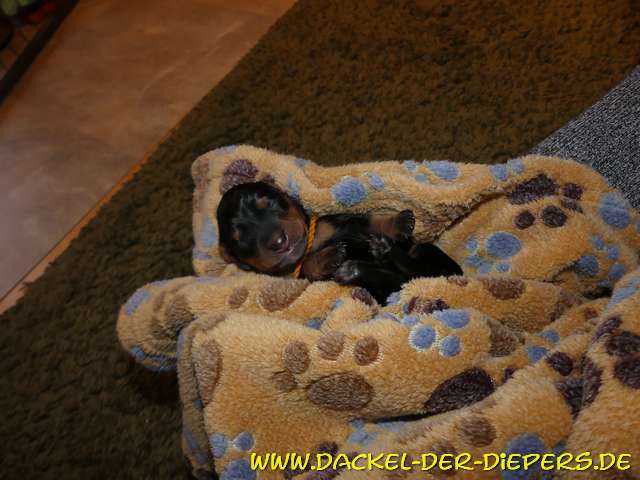 Wie immer überlassen wir es der Hündin, wo sie sich "niederlassen" möchte. Sie wird ihre Gründe haben, da wollen wir ihr nicht reinreden. Nach dem ersten Welpen bleibt sie dann auch gern in der für sie vorbereiteten Wurfkiste. ![]() Zwischen 17.35 und 22.15 Uhr waren dann alle Welpen auf der Welt Wir freuen uns nun über 5 Mädels, davon 2 in rot und 3 in schwarz-rot und einen Prinzen in schwarz-rot. Mama und Welpen sind wohlauf. Die beiden roten Hündinnen sind vorerst reserviert, sowie der schwarz-rote Rüde und eine schwarz-rote Hündin. ![]() ![]() Welpen, wie immer in der Geburtsreihenfolge rotes Band, Hündin 261g ![]() ![]() ![]() orangenes Band, Hündin 227g ![]() sie hat ein winziges Brackenfleckchen ![]() ![]() weisses Band, Hündin 242g ![]() ![]() grünes Band, rote Hündin 244g reserviert ![]() schwarz roter Rüde 265g reserviert ![]() ![]() rotes Mädel ohne Band 275g reserviert ![]() ![]() Disney ist eine sehr fürsorgliche Mama. Das Fotografieren ihrer Kleinen machte ihr schon große Sorgen, so dass wir erst einmal nur eine kleine Anzahl Bilder haben. ![]() |