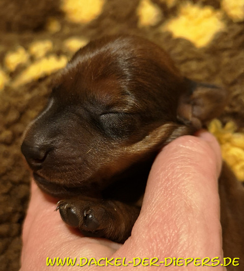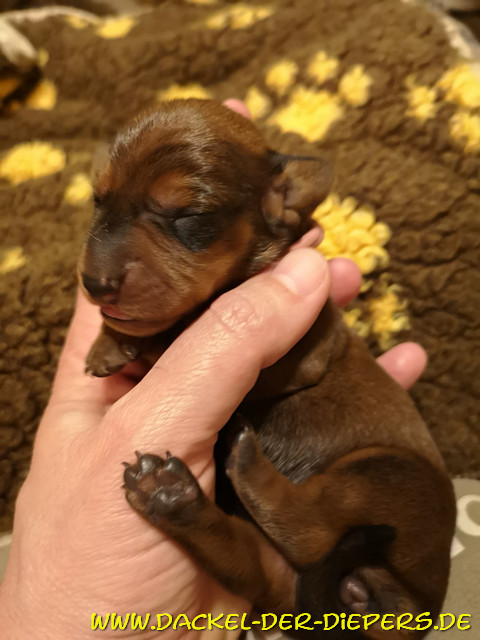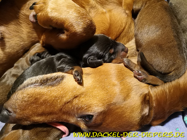 Es sind 3 rote Rüden, 2 rote Hündinnen und eine schwarzrote Hündin. Beide Eltern haben jeweils eine schwarzrote Mutter und daher war uns klar, dass eben auch schwarzrot fallen kann - wenn auch in der Minderzahl Vater ist der Rüde Dante Bella Morawia: ![]() Aus dieser Verbindung versprechen wir uns jagdlich passionierte Jagd-, aber auch ganz feine Familienhunde. Disney ist sooooo gern Mama ![]() ![]() ![]() ![]() Die Milchbar ist eröffnet ![]() ![]() der letztgeborene (Rüde) ![]() eine zarte Hündin (Nr. 4) ![]() Hündin schwarz-rot (Nr. 5) ![]() Hündin (Nr. 3) ![]() ![]() ![]() ![]() Und nun, wie immer, in der Geburtsreihenfolge: Nr. 1 roter Rüde blaues Band 297g/425g (Geburtsgewicht/5 Tage später) ![]() ![]() ![]() Nr. 2 roter Rüde ohne Band 278g/345g ![]() ![]() ![]() ![]() Nr. 3 rote Hündin rosa Band 258g/395g ![]() ![]() ![]() ![]() Nr. 4 rote Hündin ohne Band 220g/328g ![]() ![]() ![]() Nr. 5 schwarzrote Hündin 264g/362g ![]() ![]() ![]() ![]() Nr. 6 roter Rüde Tüpferlband 323g/490g ![]() ![]() ![]() Wie man lesen kann, nehmen alle sechse wunderbar zu und die roten sind super pigmentiert. Wir freuen uns auf die weitere Entwicklung. Alle Welpen sind vorerst reserviert, aber noch nicht ausgesucht. Einen weiteren Wurf Kurzhaardackel in Standardgröße vom 05.02.2019 hat mein Züchterkollege Hubert Remmelberger in 84529 Tittmoning Tel: 08683-335 hubert.remmelberger@t-online.de |