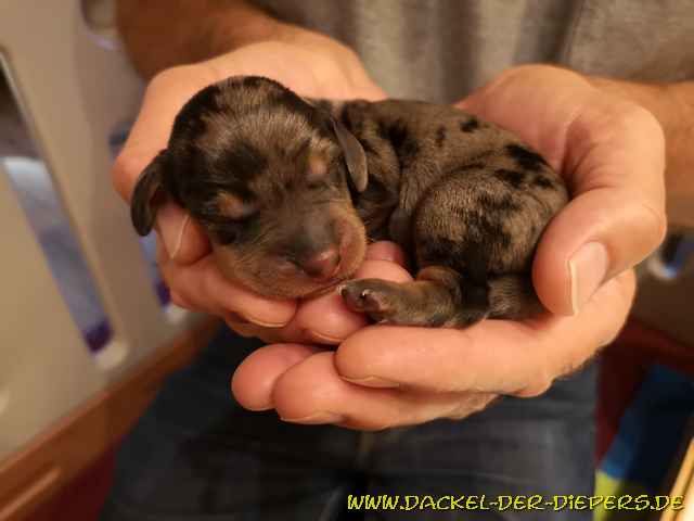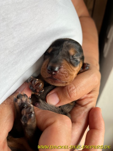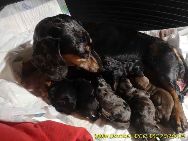 Die klassische Wurfkiste meidet Lucy stets für die Geburt. Sie zieht meist mal da, mal dort hin, was wir auch zulassen. Aber diesmal sollte es noch irrer kommen....dazu mehr später.... Hier hat sie die Eröffnungswehen in ihrem geborgenen Faltkennel. Das zog sich diesmal über eine ganze Nachtschicht, in der wir sie natürlich nicht allein ließen, und auch noch fast den ganzen weiteren Tag (Montag). ![]() Nachdem wir schon leicht mürbe beinahe einen Termin zum Röntgen ausgemacht hätten, ob womöglich eine Querlage die Geburt verhindert, kam dann Montag abend um 17.52 Uhr der erste Welpe, ein schokobraunes Mädel zur Welt. "Waldfee" - 217g ![]() Etwas flotter, 18.21 Uhr, kam dann Hündin Nr. 2 hinterher. schwarzrot Winnie - 256g ![]() Tja...und dann hatten wir mal wieder ein Novum in unserer Zuchtgeschichte: Nachdem nach 3,5 Stunden nichts weiterging, dachten wir an den Klassiker, den man schwangeren Frauen ja auch rät: spazieren gehen. Also nahm Peter Lucy widerwillig an die Leine, ich ging mit einem Handtuch natürlich hinterher. Und schwupps...kam tatsächlich Welpe Nr. 3, ein schwarzgefleckter (Tiger) Rüde ,um 22.00 Uhr mit 280g vor unserem Haus auf der Strasse auf die Welt. Und Nachbars Katze sah zu. Daher heißt dieser Rüde nun der "einsame graue" Wolf ![]() ![]() Nr.4 schloss sich wieder zügig an, bevor er womöglich auch auf die Strasse muss....und wurde um 22.38 Uhr schwarzrot mit 260g geboren. Dann kam um23.39 Uhr noch ein schwarzroter Rüde mit 233g. Diese beiden Rüden werden Willem und Watson heissen, wer welchen Namen bekommt, ist noch nicht ausgesucht. ![]() ![]() ![]() Und kurz nach Mitternacht 0.09 Uhr beendetet ein Tigermädchen/schwarzgefleckt die Geburt mit 275g. Sie wird voraussichtlich Wolke heissen. ![]() Waldfee ![]() Winnie ![]() Wolf ![]() Willem oder Watson ![]() Willem oder Watson ![]() Wolke ![]() die stolze Mama mit ihren Süßen ![]() Neue Bilder mit einer knappen Woche: Waldfee ![]() ![]() ![]() ![]() Winnie ![]() ![]() ![]() ![]() Wolf ![]() ![]() ![]() ![]() Willem/Watson ![]() ![]() ![]() ![]() ![]() Watson/Willem ![]() ![]() ![]() ![]() ![]() Wolke ![]() ![]() ![]() ![]() ![]() Alle Welpen sind bereits reserviert. Hubert Remmelberger, in 84529 Tittmoning, erwartet Mitte August Welpen. Kurzhaardackel Standard in schwarzrot Tel: 08683-335 Email: hubert.remmelberger@t-online.de |