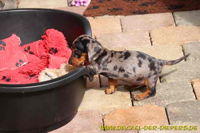 In den letzten beiden Wochen war so viel los....Besuch über Besuch So haben wir nun Bilder aus 2 Wochen eingestellt. Waldfee, Winnie, Wolf-Wotan, Loki, der Woiddeife, Willem und Wolke-Lotti haben einen enormen Wachstumsschub hingelegt und sind daher jetzt fast den ganzen Tag draußen im Garten. Sie erkunden, klettern, probieren Unsinn, raufen (bis einer weint), ruhen dann auch wieder, denn das Hirn muss die Eindrücke auch verarbeiten. Disney ist wieder, wie in allen Würfen, eine super Nanny und kümmert sich rührend ums Spielen und Erziehen. Aber auch Lucy schaut gut auf ihre Welpen, möchte sich aber aus dem "Fütterungsjob" zurückziehen. Emma ist auch oft bei den Welpen - hart, aber herzlich, macht auch sie ihren Teil und ich kann mich immer auf mein Rudel verlassen. ![]() Besuch!!!! Leider ohne Schnürsenkel... ![]() ![]() ![]() Lucy war bislang mit jedem Besuch einverstanden und genießt jede Extra Streicheleinheit. Unsere Hunde sind in den allermeisten Fällen sehr freundlich und vertrauen uns, wen wir zu den Welpen lassen. ![]() Rudelkuscheln in der Kennelbox ![]() Willem und Loki ![]() ![]() Welpen"knast", wenn die Wiese morgens noch nass ist - voll doof! ![]() Winnie ![]() Naja, mit dem Bällebad ist wenigstens etwas Abwechslung geboten. ![]() ![]() ![]() ![]() ![]() Loki, der Woiddeife ![]() ![]() Wolf-Wotan ![]() ![]() ![]() ![]() ![]() ![]() ![]() ![]() ![]() ![]() ![]() ![]() ![]() ![]() ![]() ![]() ![]() Wolke Lotti ![]() ![]() Willem ![]() ![]() Wolke ![]() ![]() ![]() ![]() unser Emmchen (Emma) ![]() ![]() ![]() ![]() ![]() Professor Arno, unser Erstgeborener, 14 Jahre der Bruder von Amica ![]() ![]() ein ganz waches Kerlchen Wir haben uns so gefreut ihn heute zu sehen ![]() ![]() ![]() ![]() ![]() So brav und vorsichtig war er mit den Welpen ![]() ![]() tolle Körperspannung für sein Alter, dass er so grau ist, macht ihn seeeehr sexy ;-) ![]() ![]() Alle Welpen sind bereits reserviert. Hubert Remmelberger, in 84529 Tittmoning, hat am 11.08. Welpen bekommen. 4 Rüden und 4 Hündinnen Kurzhaardackel Standard in schwarzrot Tel: 08683-335 Email: hubert.remmelberger@t-online.de |