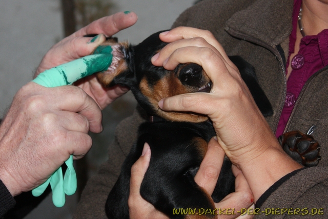 Am Tag der WurfabnahmeHeute war der große Tag für uns und vor allem für unsere Zwergenkönige.Familie Ober, unsere Zuchtwarte, kam und schaute sich die Welpen gründlich an. Anschließend wurden sie tätowiert. Das war natürlich aufregend und auch etwas schmerzhaft. Aber nach wenigen Sekunden war auch das schon wieder vergessen. ![]() ![]() Die "böse" Zange ![]() "Puh, ja, das Frauchen schaut ganz bös. Das liegt aber daran, weil sie uns so konzentriert festgehalten hat." ![]() Nach den Löchern kam die Tätowierfarbe. Das war dann schon wieder ganz harmlos! ![]() Hier konnten wir alle schon wieder lächeln... ![]() der nächste bitte... ![]() ![]() ![]() |