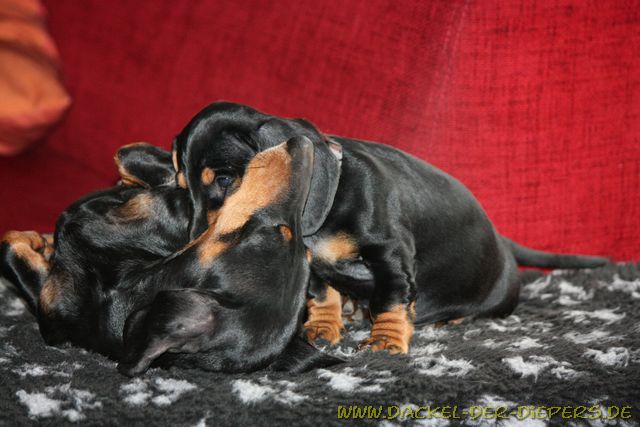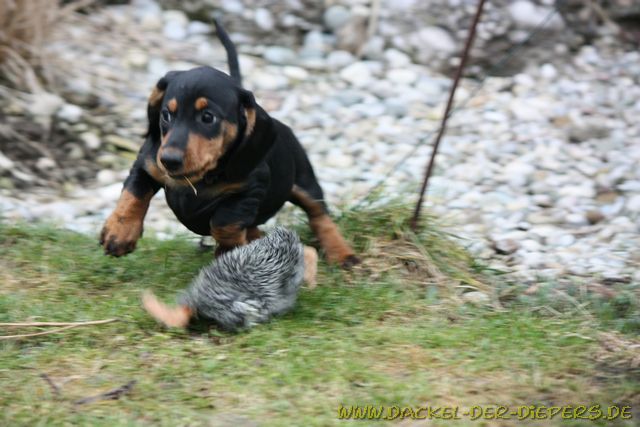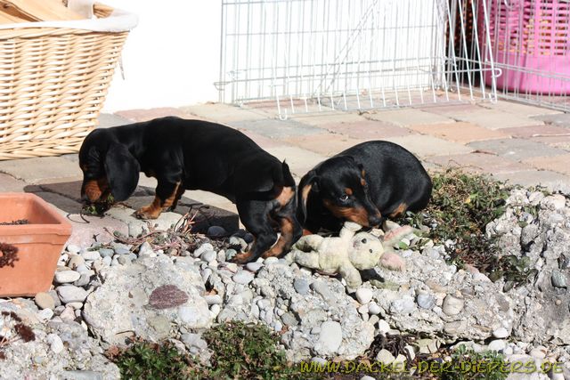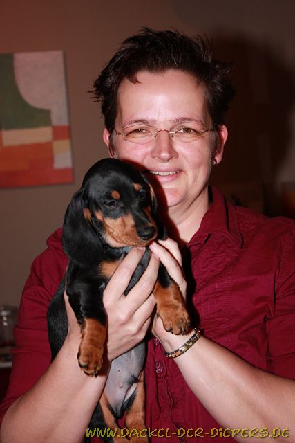 | Eine Woche später: Luca und Emmi im Garten, mittlerweile 10 Wochen jung ![]() ![]() Emmi ![]() Für Wella hieß es heute Abschied nehmen Das war für mich nochmal wieder ein besonders schwerer Tag. Wella ähnelt Karla als Welpe sehr! ![]() ![]() ![]() ![]() Luca darf noch eine Woche hierbleiben ![]() ![]() ![]() ![]() Emmi bleibt auch noch bis Anfang März, aber wir haben das zukünftige neue Zuhause gestern schon mal inspiziert. Erst Autofahren geübt und dann: was für ein Garten - ein Dackelparadies!!! Pssst..... inclusive Fasane zum jagen..... ![]() ![]() Emmi in Aktion ![]() ![]() Karla jagt ihre Wella nochmal ordentlich durch den Garten ![]() ![]() ![]() ![]() Wella ![]() ![]() ![]() Luca ![]() danach waren sie hundemüde und kuschelten sich in den Kennel ![]() Amica (li) und Karla (re) Hier lässt sich das Tochter/Mutter Verhältnis nicht leugnen. Wir sind froh, dass die beiden sich so gut verstehen, auch jetzt während der Welpenzeit. Dass wir anfangs so penibel aufgepasst haben, dass Karlas Mutterrechte nicht übersehen werden, hat sich bewährt. Dafür war sie jetzt in der Junghundezeit umso gelassener, wenn Amica als große (Halb-) Schwester mit den Kleinen spielte. ![]() Karla mit Wella ![]() ![]() ![]() ![]() ![]() ![]() ![]() ![]() ![]() ![]() Der Abschied naht - für uns Der kleine Raphael freut sich umso mehr! ![]() ![]() Wella war überhaupt nicht scheu "Los, kleiner Freund, lass dich abbusseln!" ![]() In dem schönen Bergdorf Fliess in Österreich wartet noch die Oma ganz sehnsüchtig auf ihre Dackeline ![]() Die erste Rückmeldung von Wella: die Autofahrt ging prima, die ganze Familie ist happy, Wella schläft bei der Oma im Bett und ist rundherum zufrieden im neuen Zuhause. Raphael ist mittlerweile ihr bester Spielkamerad. Emmi und Luca ![]() ![]() ![]() ![]() ![]() Nach dem Toben im Garten fallen die beiden totmüde in den Tiefschlaf. ![]() Luca ![]() Emmi ![]() In den mittlerweile viel zu großen Hundekorb gesellt sich immer häufiger Halbschwester Amica. ![]() ![]() Luca ![]() Wenn da einer seine Schuhe nicht aufräumt, ist es unsere Schuld nicht..... ![]() ![]() Luca - unbestrittener Stöckchenkönig..... ![]() ....und der mit dem sanftesten Blick ![]() ![]() ![]() Emmi ![]() Laurin mit Luca ![]() Paulina mit Emmi ![]() und mit Luca ![]() Emmi ![]() Emmi ist in den letzten beiden Tagen hier Prinzessin, auch ihr Bruder ist ausgezogen. ![]() Aber sie ist ja nicht allein. Karla kümmert sich immer noch rührend. ![]() ![]() ![]() Karla, unsere Chefin! ![]() Mittlerweile ist auch Emmi im neuen Zuhause. Auch da hört sich die erste Rückmeldung sehr gut an: "....auch der 2. Tag ist voellig reibungslos verlaufen. Emmi ist neugierig, selbstbewusst, verschmust und verspielt - es passt einfach alles. Auch die Verdauung klappt sehr gut (kein Durchfall, keine Verstopfung) und wir haben grosse Freude mit dem Dackelmaedchen. Heute ist sie mit mir ohne Leine auf unserem Grundstueck herumgelaufen und reagiert schon super auf ihren Namen - sie kommt tatsaechlich her, wenn man sie ruft. Wenn sie nicht mehr draussen sein mag, weiss sie den Weg zur Haustuere und bleibt auf der Fussmatte sitzen, bis man ihr die Tuere oeffnet und sie ins Warme kann...." |