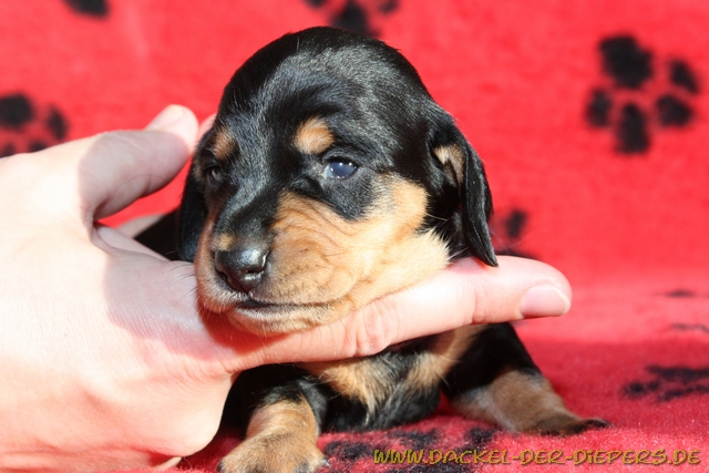 Jetzt sind unsere 7 Zwerge schon 2 Wochen alt und machen uns sehr viel Freude. Sie wachsen und sind so richtig schön ausgeglichen. Bislang sind sie mit viel Wärme, Mama und Schlafen voll zufrieden. Aber das wird sich bald ändern, denn pünktlich zu Weihnachten machten die 7 ihre Augen auf. Sie schauen aber noch recht verschlafen. Karla orientiert sich so langsam wieder in Richtung normales Leben. Sie reagiert nicht mehr so gereizt auf Amica und Arno. Alle laufen wieder unbekümmert rum. Nur ran an die Welpen dürfen die beiden anderen noch nicht. Bei Menschen wird sie da schon langsam gelassener. Der Verwandtschaft an Weihnachten wurde der Nachwuchs schon stolz präsentiert. Sie geht schon kleinere Spaziergänge wieder mit, aber wir müssen aufpassen, dass die Kleinen anschließend kein Milchspeiseeis zu nuckeln bekommen. Außerdem müssen wir sorgfältig ihr Gesäuge vom Tausalz reinigen. Aber das machen wir gern, wenn sie dafür wieder mit uns gehen mag. Nun gibt es für die vielen netten Anfragen die neuesten Fotos von heute. Erste Besucher habe sich bereits angemeldet. Wir freuen uns darauf, die zukünftigen glücklichen Dackelbesitzer frühzeitig kennenzulernen, denn wir stellen uns für unsere kleinen "Wummis" nur das allerbeste Zuhause vor. Die Erstgeborene (252g) 770g jetzt oranges Bändchen ![]() ![]() Der zweite Welpe, auch eine Hündin (238g) 690g orange-lila Bändchen ![]() ![]() Als dritter kam dann der erste Rüde (265g) 758g orange-grünes Bändchen ![]() ![]() ![]() ![]() ![]() Nummer 4 ist auch ein Rüde (240g) 748g grün-schwarzes Bändchen ![]() ![]() ![]() ![]() Der 5. Welpe, wieder eine Hündin (246g) 758g weisses Bändchen ![]() ![]() Wenn ich nicht gleich zurück an Mamas Bar komme, beiß ich dir den Finger ab, du wirst schon sehen. Ich bin ein gefährlicher Dackel!!! ![]() Nummer 6 dann wieder ein Rüde (264g) 691g hellblaues Bändchen ![]() Karla musste natürlich genau aufpassen, dass wir den Kleinen nichts "wegfotografieren" ![]() Nummer 7, eine Hündin (244g) 700g graues Band ![]() ![]() ![]() ![]() ![]() ![]() ![]() |