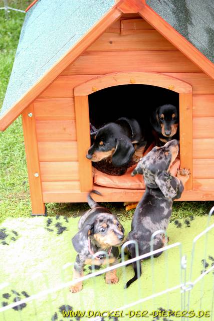 | Wir suchen immer noch für den Tigerrüden Faust und die Tigerhündin Filia ein tolles, dackelgerechtes Zuhause Nachdem die Welpen jetzt gekochtes Fleisch und (getreidefreies) Trockenfutter kennengelernt haben, wurde es jetzt mal Zeit für die richtig grosse "Raubtierfütterung" Heute gab es frisches Rinderherz, eingeweichtes Gemüse (als reine Gemüseflocke - ohne Getreide!) Hüttenkäse und 2 Eigelb. Angereichert mit etwas gutem Öl und unseren bewährten Flohsamen. Das Thema `gutes Hundefutter´ liegt mir sehr am Herzen und mir wird da keine Frage zu viel. Wieder möchte ich meinen Lesern/Welpeninteressenten das Buch: "Katzen würden Mäuse kaufen" von Hans Ulrich Grimm empfehlen. ![]() zusammengemixt... ![]() ...und inhaliert ![]() Lecker!!!!! ![]() ![]() 11.05. Wir haben ein paar Tage Regen. Aber die Welpen wollen unbedingt draussen bleiben. Drinnen jammern sie, weil es ihnen zu langweilig ist. Also haben wir ihnen die Hundehütte unter den grossen Sonnenschirm gestellt. Da kuscheln sie sich rein oder spielen davor. ![]() Und schon wieder Besuch mit Hosenbeinen und Schnürsenkeln zum spielen ![]() Flori ![]() Wie die grossen Hofhunde vor ihrer Hütte..... ![]() Falco (hinten), Hannibal und Flori ![]() Hannibal ![]() "Oh, da könnte man ja glatt zum Wiederholungstäter werden" Aber dieser nette Besuch ist bereits ganz glücklich mit Zwergenkönig Eike-Paula, der braungetigerten Hündin vom letzten Jahr. Mehr Fotos dazu unter aktuelles..... ![]() |